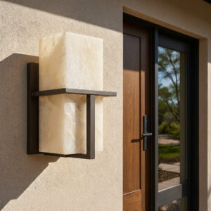 Mit ihrer klaren Form, dem dunklen Metallrahmen und dem sanft leuchtenden Diffusor mit Marmoreffekt setzt sie stilvolle Akzente an Fassaden, Eingängen oder Terrassen.